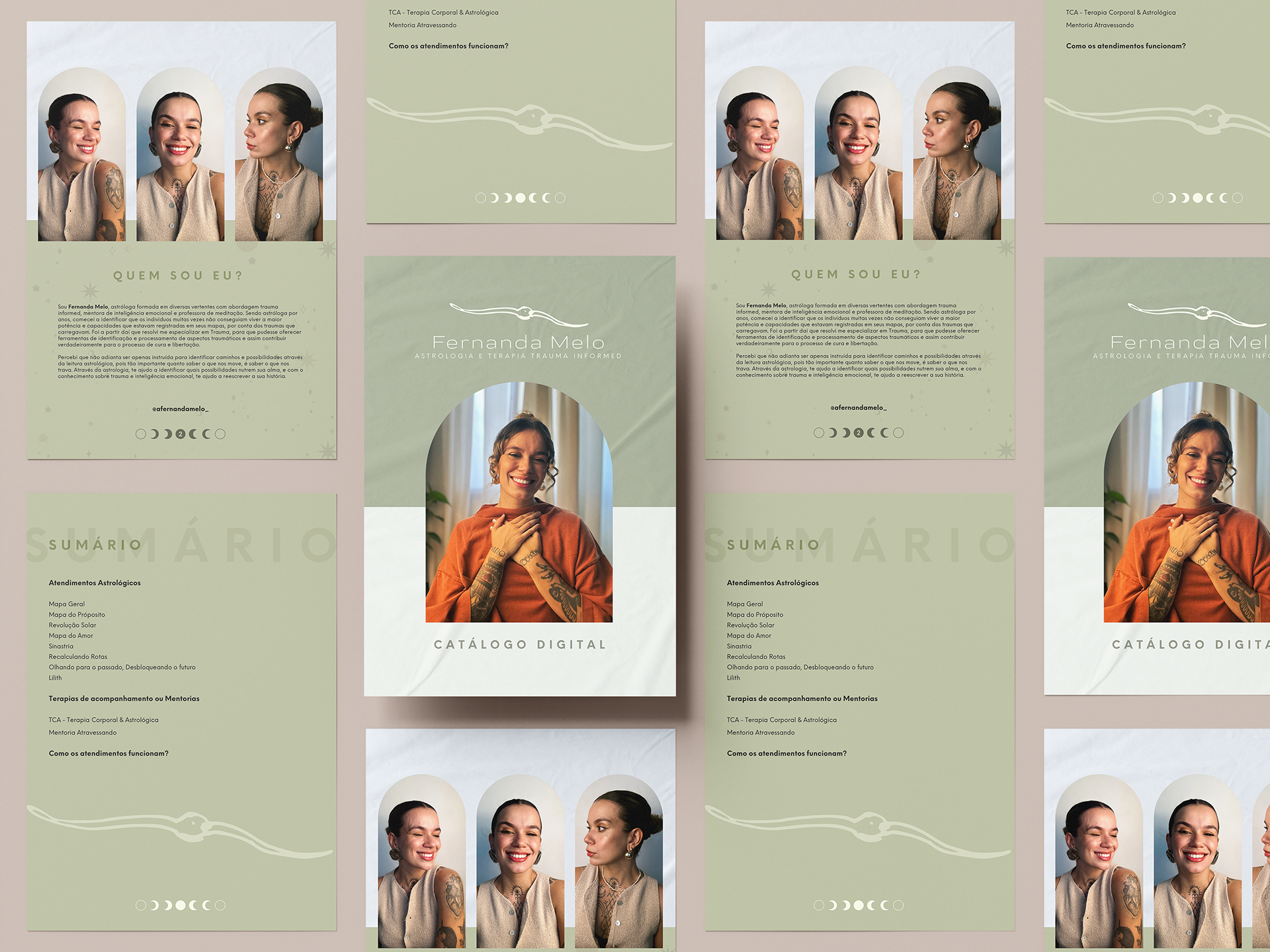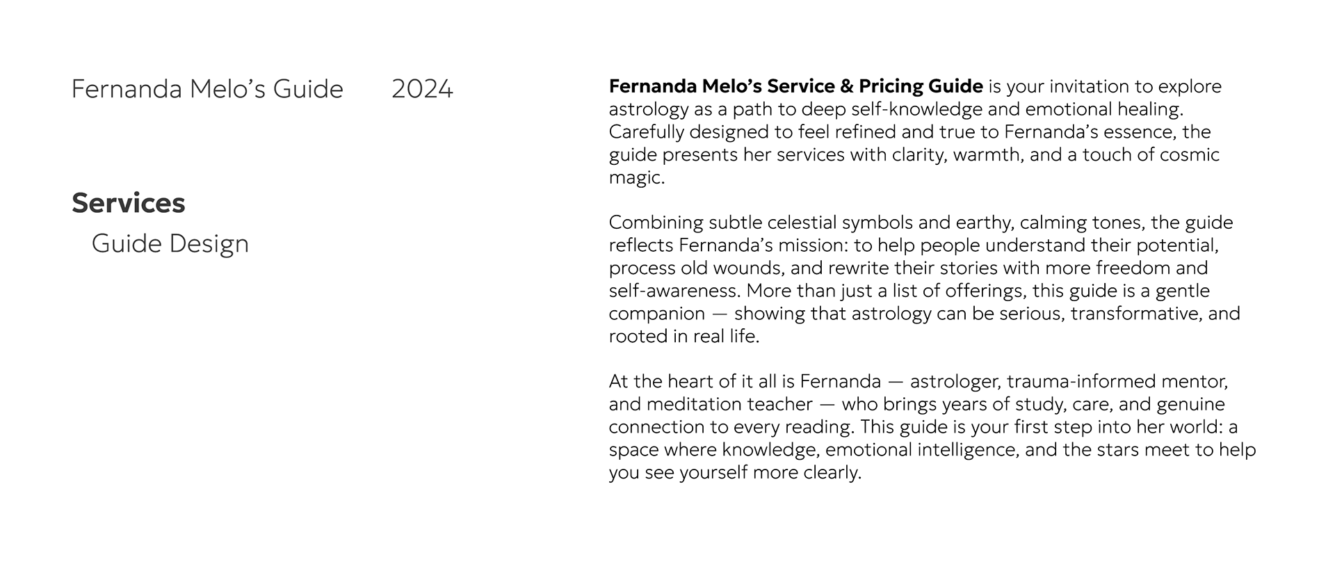 As a freelance designer, I created Fernanda Melo’s Service & Pricing Guide to blend astrology and self-knowledge into a polished, trustworthy presentation. Fernanda wanted a guide that felt sophisticated yet personal — something that reflects her mission to bring depth and professionalism to the world of astrology and self-development. Inspired by her wish for darker tones balanced with earthy neutrals, the design sets a refined tone while staying warm and inviting. This project combines thoughtful layout, calming colours, and subtle celestial details to communicate Fernanda’s approach: making self-knowledge accessible, serious, and deeply connected to each client’s journey. Delivered as an easy-to-access presentation, the guide helps her share her services clearly and beautifully — no stereotypes, just authentic connection.