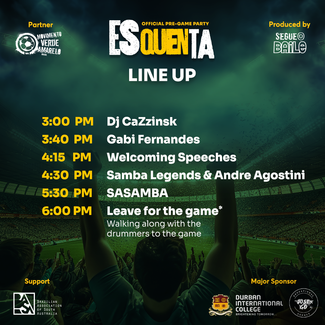 On 24 July 2023, as Adelaide hosted its first FIFA Women’s World Cup match, Segue OBaile delivered Esquenta, a vibrant pre-game celebration that brought Brazil’s football spirit to life. The event featured live samba and pagode, drummers leading fans from the venue to the stadium, and authentic Brazilian food and drinks, creating an atmosphere that blended culture, music, and sport.