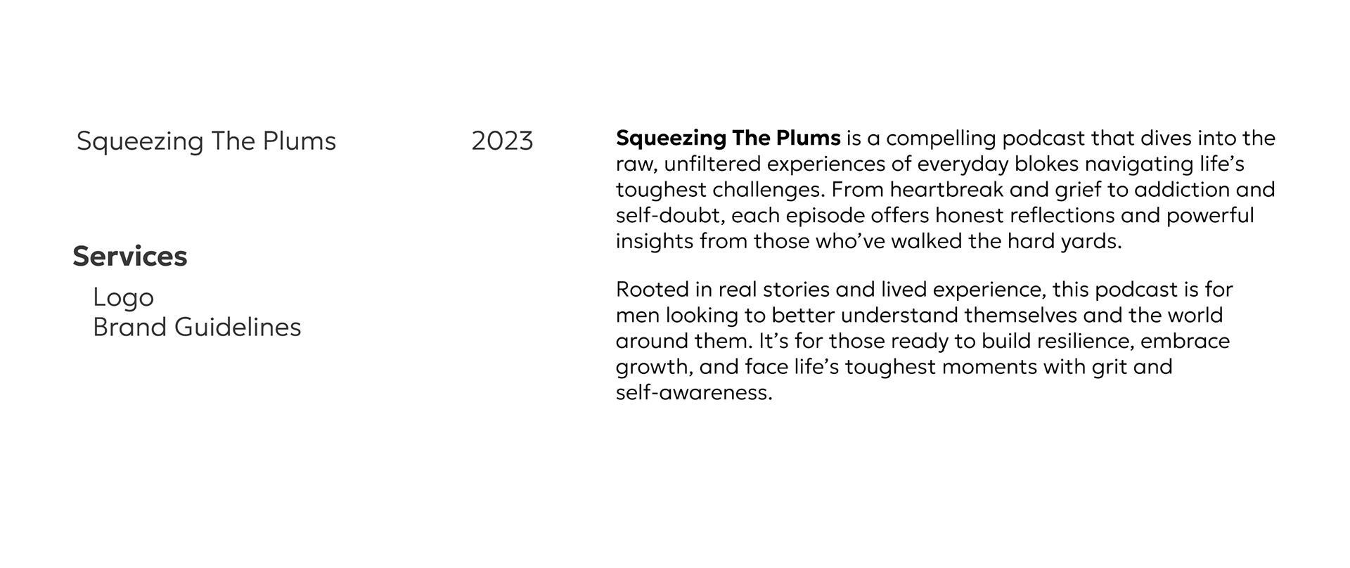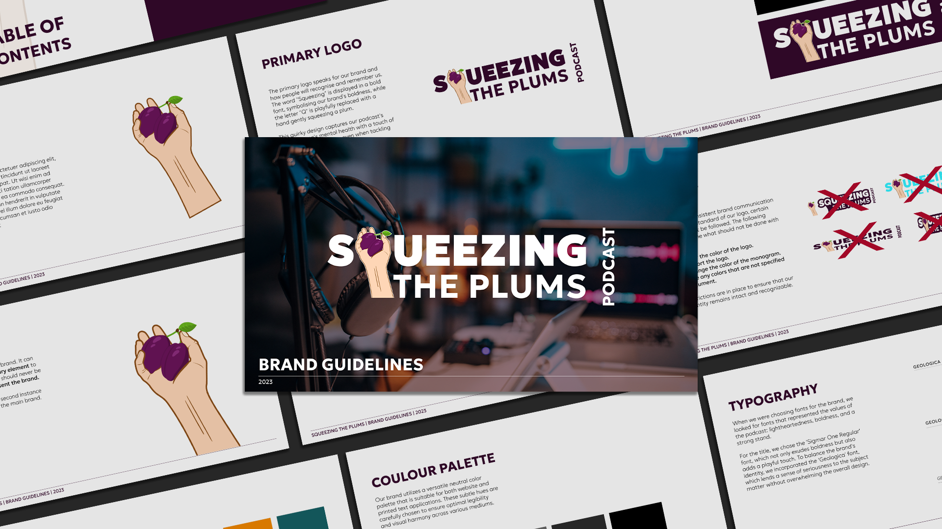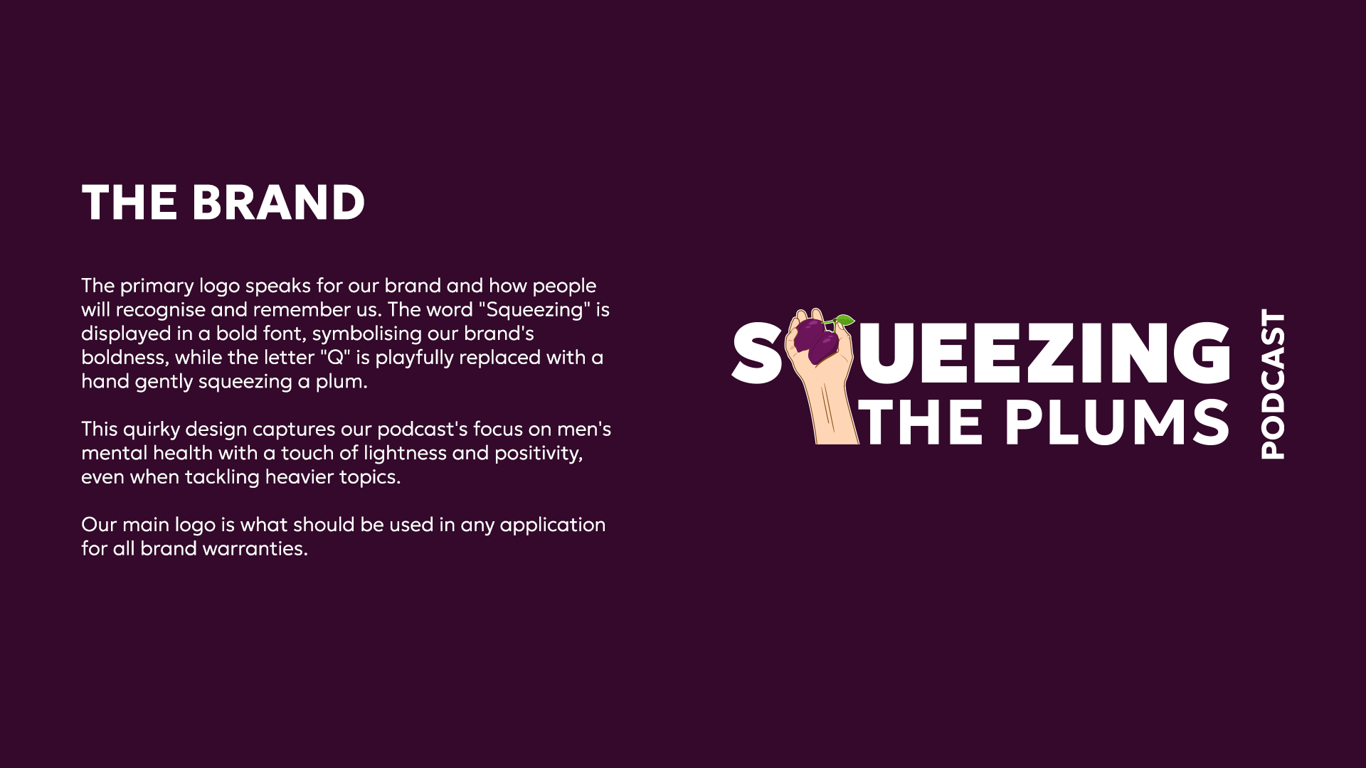 As Head of Creative at Neon Treehouse, I was responsible for designing the logo, selecting the colour palette, and developing the brand guidelines for Squeezing The Plums. The goal was to build a distinctive and cohesive visual identity that reflects the brand’s values and resonates deeply with its audience. A key feature of the logo is the hand gently squeezing a plum instead of the letter “Q” — a playful, memorable detail that adds a light-hearted touch to the podcast’s honest conversations around men’s mental health.